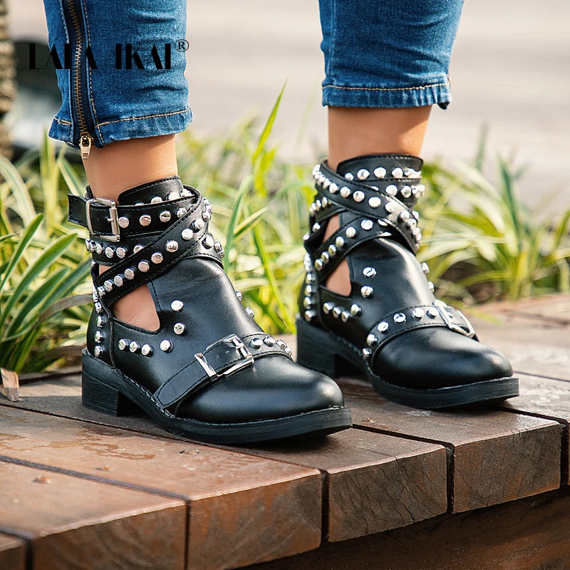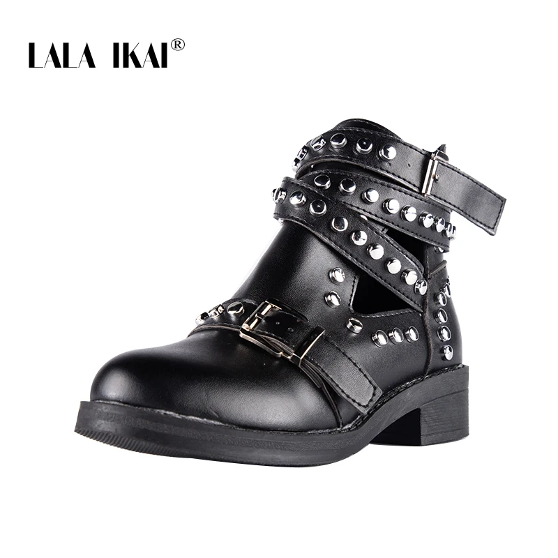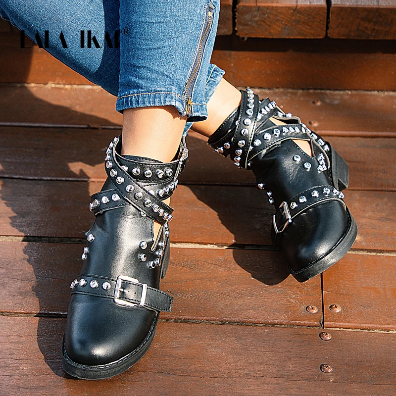 Best . (40% Off) Buy LALA IKAI Women Black Ankle Boots Buckle Strap Rivet Shoes Female Pu leather Motorcycle Boots Autumn Punk Boots XWA5139 4 Price Online.
