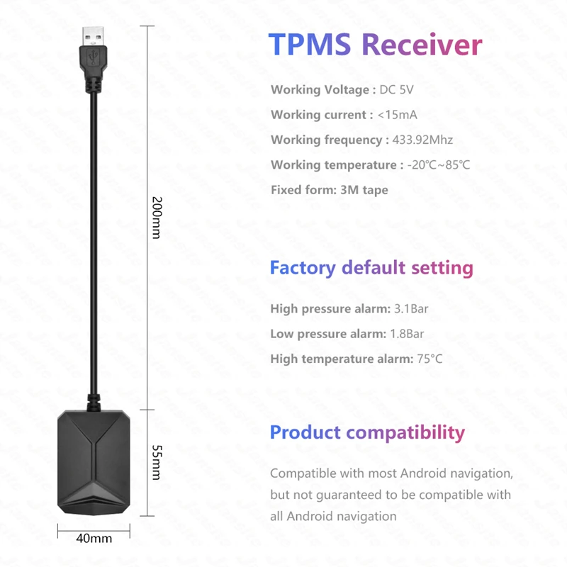 Product Name: USB Android TPMS Tire Pressure Monitoring System Display 5V 4 Internal Sensors Android Navigation Car Radio Summer Winter Tire