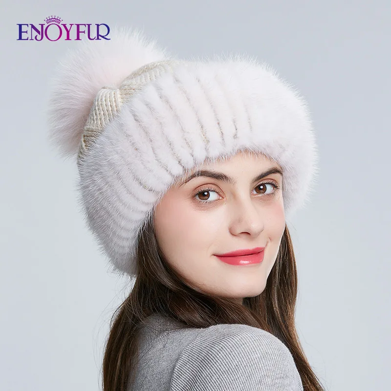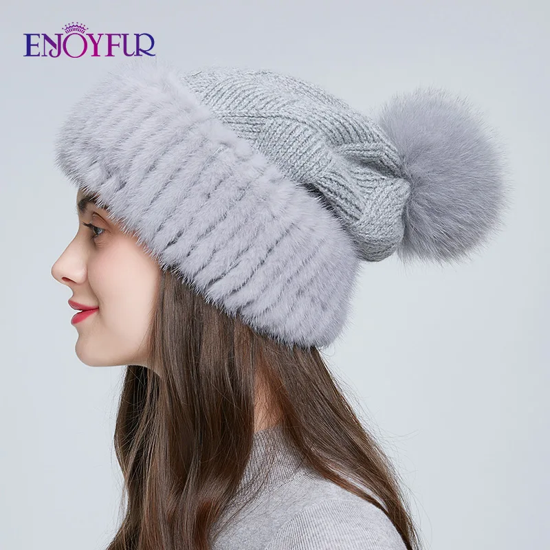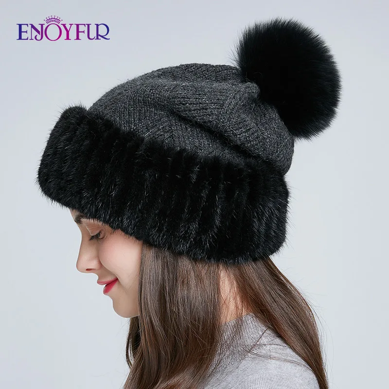Special Offer ENJOYFUR winter mink fur knitted wool hats for women fox fur pompom slouchy beanies fashion warm style caps for youth Discount 40% Today!