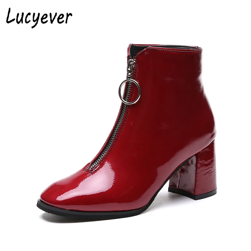 Product Name: 2020 Autumn Winter High Heels Square Toe Ankle Boots for Women Fashion Patent Leather Shoes Woman Zip Motorcycle Booties Mujer